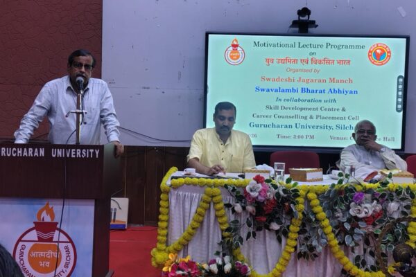 বরাক তরঙ্গ, ২৫ মার্চ : গুরুচরণ বিশ্ববিদ্যালয়ের দক্ষতা উন্নয়ন কেন্দ্র ও ক্যারিয়ার কাউন্সেলিং সেলের সহযোগিতায়, স্বদেশী জাগরণ মঞ্চ এবং স্বাবলম্বী ভারত অভিযান যৌথভাবে ‘যুব উদ্যমিতা এবং বিকশিত ভারত’ বিষয়ক একটি প্রেরণামূলক বক্তৃতা অনুষ্ঠানের আয়োজন করা হয়। বুধবার অনুষ্ঠানে উপস্থিত ছিলেন গুরুচরণ বিশ্ববিদ্যালয়ের উপাচার্য অধ্যাপক নিরঞ্জন রায়, নিবন্ধক ড. বিদ্যুৎকান্তি পাল, শৈক্ষিক নিবন্ধক ড. অভিজিৎ নাথ,…