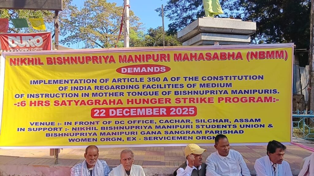 বরাক তরঙ্গ, ২২ ডিসেম্বর : বরাক উপত্যকার তিনটি জেলায় প্রাথমিক স্তরে বিষ্ণুপ্রিয়া মণিপুরি ভাষাকে পাঠমাধ্যম হিসেবে চালু করার দাবিতে নিখিল বিষ্ণুপ্রিয়া মণিপুরি মহাসভা সোমবার কাছাড় জেলা কমিশনার অফিসের সামনে থাকা শহিদ ক্ষুদিরাম বসুর পাদুদশে বসে ৬ ঘণ্টার সত্যাগ্রহ অনশন কর্মসূচি পালন করেছে। সকাল ১০টা থেকে শুরু হওয়া এই কর্মসূচিতে সত্যাগ্রহীরা মুখ্যমন্ত্রীকে স্মারকপত্র জমা দিয়ে তাঁদের দীর্ঘদিনের দাবি তুলে ধরেছে।