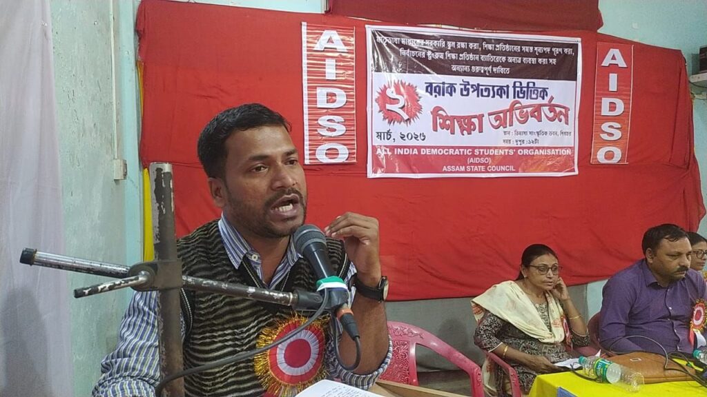 বরাক তরঙ্গ, ২ মার্চ : মাতৃভাষা মাধ্যমের সরকারি স্কুল রক্ষা, শূন্যপদে দ্রুত শিক্ষক নিয়োগ এবং অশিক্ষক কাজে শিক্ষকদের ব্যবহার না করা এবং শিক্ষা প্রতিষ্ঠানকে নির্বচনী কাজে ব্যবহার করে দীর্ঘদিন পঠনপাঠনে বাধা সৃষ্টি না করার দাবিতে সোমবার শিলচরের ডিমাসা ভবনে এক বিশাল শিক্ষা অভিবর্তন অনুষ্ঠিত হয়। এআইডিএসও’র অসম রাজ্য কাউন্সিলের আহ্বানে আয়োজিত এই ‘বরাক উপত্যকা ভিত্তিক শিক্ষা অভিবর্তন’-এ তিন জেলার শতাধিক ছাত্র প্রতিনিধির উপস্থিতিতে সম্পন্ন হয়। এআইডিএসও’র অসম রাজ্য কাউন্সিলের সহ-সভাপতি ও কাছাড় জেলা কমিটির সভাপতি স্বাগতা ভট্টাচার্যের সভাপতিত্বে অনুষ্ঠিত শিক্ষা অভিবর্তনে বক্তব্য রাখেন এআইডিএসও’র সর্বভারতীয় কাউন্সিলের সহ-সভাপতি ও অসম রাজ্য কাউন্সিলের সভাপতি হিল্লোল ভট্টাচার্য, সংগঠনের সর্বভারতীয় কাউন্সিলের যুগ্ম সম্পাদক ও ত্রিপুরা রাজ্য কমিটির সভাপতি রামপ্রসাদ আচার্য প্রমুখ। বক্তারা বর্তমান শিক্ষা ব্যবস্থার সংকটের কথা তুলে ধরে বিষদ আলোচনা করেন।