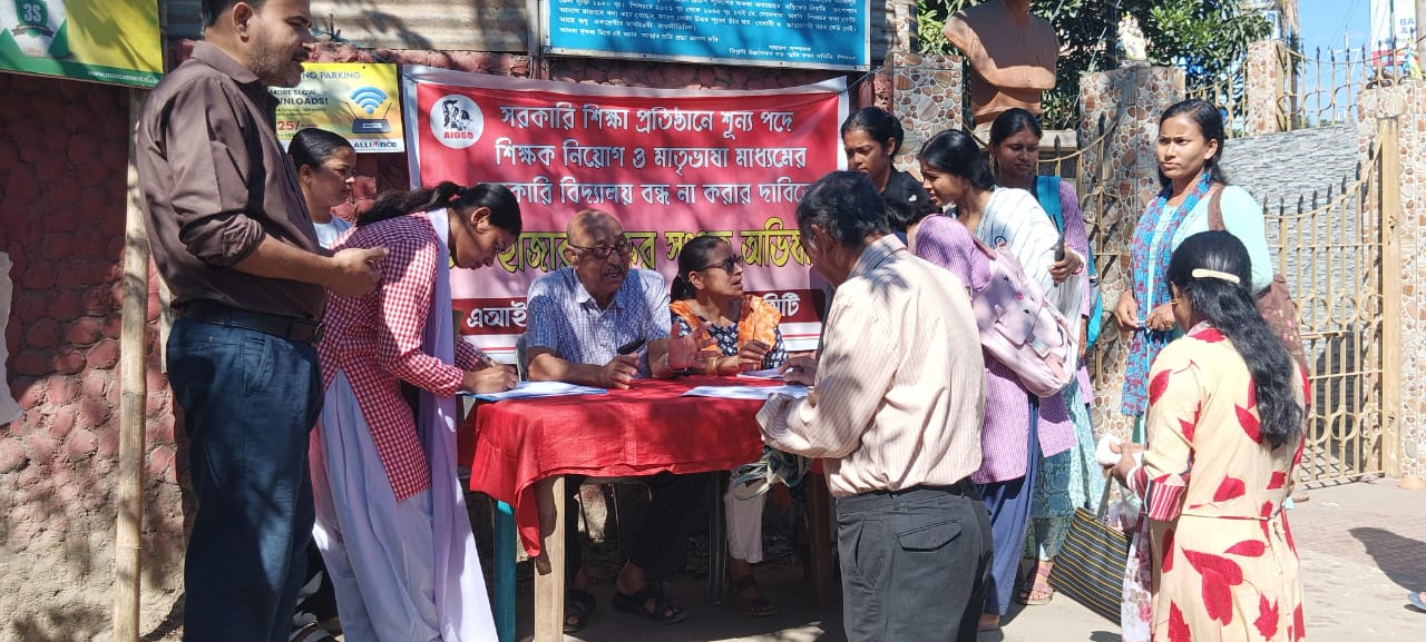 বরাক তরঙ্গ, ১৯ নভেম্বর : সরকারি শিক্ষা প্রতিষ্ঠানে শূন্য পদে শিক্ষক নিয়োগ করা এবং ক্লোজার–মার্জার নীতি প্রয়োগ করে মাতৃভাষা মাধ্যমের সরকারি বিদ্যালয় বন্ধ না করার দাবিতে বুধবার এআইডিএসও’র কাছাড় জেলা কমিটির পক্ষ থেকে ৫০ হাজার গণস্বাক্ষর সংগ্রহ অভিযানের সূচনা করা হয়। গণ স্বাক্ষর সংগ্রহ অভিযানের সূচনা আজ শিলংপট্টিস্থ বিপ্লবী উল্লাসকর দত্তের মূর্তির পাদদেশে একটি অনুষ্ঠানের মাধ্যমে করা হয়। অনুষ্ঠানে উপস্থিত ছিলেন অবসরপ্রাপ্ত শিক্ষক ও বিশিষ্ট সমাজসেবী শ্রী সুব্রত চন্দ্র নাথ।