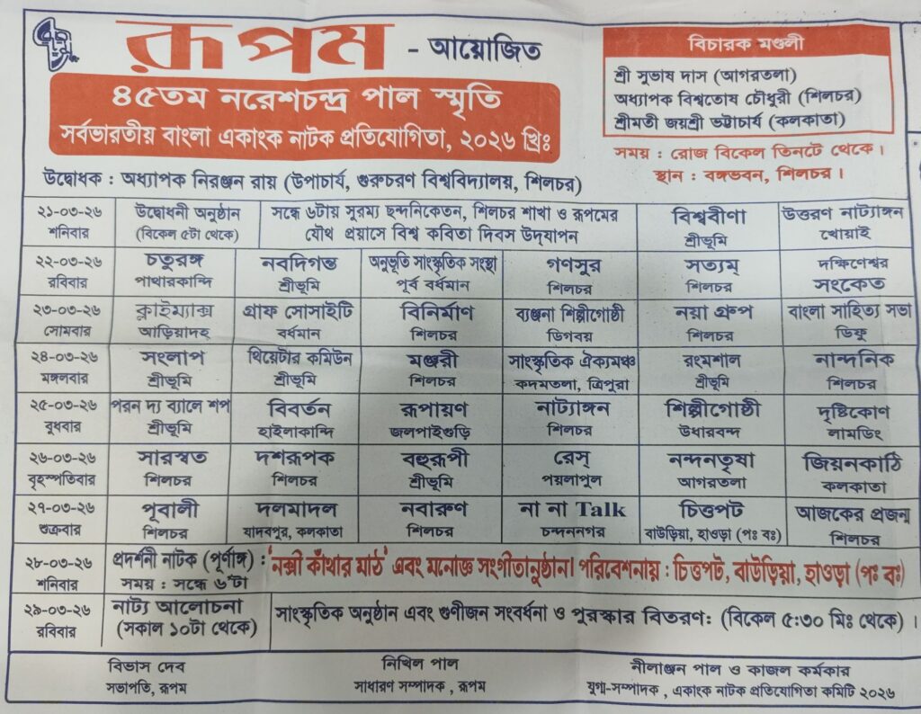 আয়োজকদের পক্ষ থেকে জানানো হয়েছে, এটি ৪৫তম নরেশ চন্দ্র পাল স্মৃতি নাট্যোৎসব। দেশের বিভিন্ন প্রান্ত থেকে আগত নাট্যদলগুলি এই প্রতিযোগিতায় অংশগ্রহণ করবে। প্রতিদিন বিকেল ৩টা থেকে শুরু হবে নাট্য মঞ্চায়ন। ন’দিনের এ প্রতিযোগিতা চলবে ২৯ মার্চ অবধি। বরাক উপত্যকা ছাড়াও বহিরবরাক এবং ত্রিপুরা ও পশ্চিমবঙ্গ থেকে মোট ৩৮টি নাট্যদল এই প্রতিযোগিতায় অংশ নিচ্ছে। তাছাড়াও থাকছে প্রদর্শনীমূলক হাওড়ার বাউড়িয়ার চিত্তপট নাট্যদল প্রযোজিত বহু-প্রশংসিত পূর্ণাঙ্গ নাটক ‘নকশিকাঁথার মাঠ’। এটি মঞ্চস্থ হবে ২৮ মার্চ শনিবার সন্ধ্যা ৬টায়।