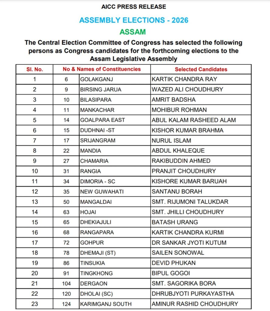 বরাক তরঙ্গ, ১৪ মার্চ : কংগ্রেসের কেন্দ্রীয় নির্বাচন কমিটি আসন্ন অসম বিধানসভা নির্বাচনের প্রার্থীদের দ্বিতীয় তালিকা প্রকাশ করেছে। দ্বিতীয় তালিকায় রয়েছেন ২৩ জন প্রার্থী। কাছাড়ের ধলাই (এসসি) আসনে টিকির পান ধ্রুবজ্যোতি পুরকায়স্থ এবং দক্ষিণ করিমগঞ্জ আসনে আমিনুর রশিদ চৌধুরী পেয়েছেন। এ ছাড়া গোলকগঞ্জ কেন্দ্রে কার্তিকচন্দ্র রায়, বীরসিং জারুয়া আসনে ওয়াজেদ আলি চৌধুরী, বিলাসীপাড়ায় অমৃত বাদশা, মানকাচর কেন্দ্রে মহিবুর রহমান, গোয়ালপাড়া পূর্ব আসনে আবুল কালাম রশিদ আলম, দুধনৈ (এসটি)তে কিশোর কুমার ব্রহ্ম, শ্রীজংগ্রাম কেন্দ্রে নুরুল ইসলাম, মান্দিয়ায় আব্দুল খালেক, চামারিয়ায় রাকিবউদ্দিন আহমেদ, রাঙ্গিয়ায় প্রাণজিৎ চৌধুরী, ডিমোরিয়া (এসসি) আসনে কিশোরকুমার বরুয়া, নিউ গুয়াহাটিতে শান্তনু বরা, মঙ্গলদৈ কেন্দ্রে রিজুমণি তালুকদার, হোজাইয়ে ঝিল্লি চৌধুরী, ঢেকিয়াজুলিতে বাতাশ উরাং, রাঙাপাড়ায় কার্তিকচন্দ্র কুর্মি, গহপুর আসনে শঙ্করজ্যোতি কুটুম, ধেমাজি (এসটি) আসনে সাইলেন সোনোয়াল, তিনসুকিয়ায় ডেভিড ফুকন, টিংখং কেন্দ্রে বিপুল গগৈ ও দেরগাঁওয়ে সাগরিকা বরা।