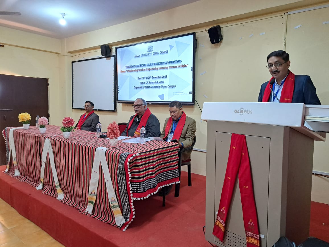 বরাক তরঙ্গ, ২৬ ডিসেম্বর : আসাম বিশ্ববিদ্যালয়ের আতিথেয়তা ও পর্যটন ব্যবস্থাপনা বিভাগের উদ্যোগে বিশ্ববিদ্যালয়ের ডিফু ক্যাম্পাসে সম্প্রতি হোমস্টে নিয়ে তিনদিনের কর্মশালা অনুষ্ঠিত হয়। কর্মশালার উদ্বোধন করেন ডিফু ক্যাম্পাসের সহ-উপাচার্য অধ্যাপক শিবাশিস বিশ্বাস। উদ্বোধনী ভাষণে তিনি ডিফু অঞ্চলে টেকসই পর্যটন মডেল হিসেবে হোমস্টের ক্রমবর্ধমান গুরুত্বের কথা তুলে ধরেন। তিনি বলেন, হোমস্টে স্থানীয় সংস্কৃতি ও ঐতিহ্য সংরক্ষণের পাশাপাশি কর্মসংস্থান সৃষ্টি, নারী ক্ষমতায়ন ও গ্রামীণ জীবিকায়ন উন্নয়নে গুরুত্বপূর্ণ ভূমিকা পালন করে।