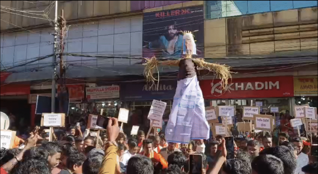 বরাক তরঙ্গ, ২১ ডিসেম্বর : প্রতিবেশী রাষ্ট্র বাংলাদেশে হিন্দু সংখ্যালঘুদের ওপর সংঘটিত একের পর এক নৃশংস হামলা এবং দিপুচন্দ্র দাস নামে এক হিন্দু যুবককে প্রকাশ্যে মারধর করে আধমরা অবস্থায় পুড়িয়ে হত্যার ঘটনায় তীব্র ক্ষোভ প্রকাশ করল বজরং দল ও বিশ্ব হিন্দু পরিষদ। রবিবার শিলচরের গোলদিঘী মলের সামনে দু’টি হিন্দুত্ববাদী সংগঠন একত্রিত হয়ে বিক্ষোভ সমাবেশের আয়োজন করে। সমাবেশে বাংলাদেশ সরকারের বিরুদ্ধে তীব্র প্রতিবাদ জানানো হয় এবং জেহাদি মৌলবাদীদের বিরুদ্ধে স্লোগান তোলা হয়। বিক্ষোভ চলাকালীন মোহাম্মদ ইউনুসের কুশপুতুল দাহ করেন সংগঠনের কর্মকর্তারা।