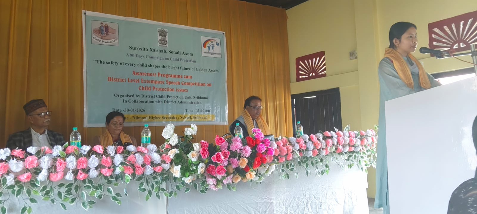বরাক তরঙ্গ, ৩০ জানুয়ারি : প্রত্যেক শিশুর নিরাপত্তাই সোনালী অসমের উজ্জ্বল ভবিষ্যৎ গঠন করে,এই মূলমন্ত্রকে সামনে রেখে শুক্রবার শ্রীভূমির নীলমণি উচ্চতর মাধ্যমিক বিদ্যালয়ে “সুরক্ষিত শৈশব, সোনালী অসম” শীর্ষক ৯০ দিনের রাজ্যব্যাপী শিশু সুরক্ষা অভিযানের অংশ হিসেবে একটি বিশেষ সচেতনতামূলক কর্মসূচি ও জেলাভিত্তিক তাৎক্ষণিক বক্তৃতা প্রতিযোগিতা অনুষ্ঠিত হয়। জেলা শিশু সুরক্ষা ইউনিট (DCPU) এবং শ্রীভূমি জেলা প্রশাসনের যৌথ উদ্যোগে আয়োজিত এই অনুষ্ঠানে শিশুদের সুরক্ষা, অধিকার এবং তাদের নিরাপদ শৈশব নিশ্চিত করার লক্ষ্যে বিভিন্ন গুরুত্বপূর্ণ দিক নিয়ে আলোচনা করা হয়। সকাল ১১টা থেকে শুরু হওয়া এই কর্মসূচিতে বিভিন্ন শিক্ষা প্রতিষ্ঠানের শিক্ষার্থীরা অত্যন্ত উৎসাহের সাথে অংশগ্রহণ করে।