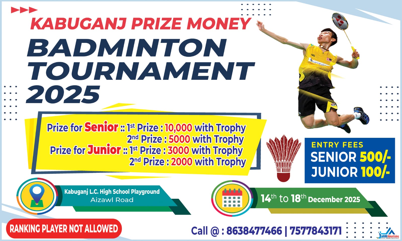 বরাক তরঙ্গ, ৬ ডিসেম্বর : কাবুগঞ্জে শুরু হচ্ছে ব্যাডমিন্টন টুর্নামেন্ট ২০২৫। আগামী ১৪ ডিসেম্বর কাবুগঞ্জ এলসি হাইস্কুলের খেলার মাঠে টুর্নামেন্টের আয়োজন করছে কাবুগঞ্জ ব্যাডমিন্টন অ্যাকাডেমি। চলবে ১৮ ডিসেম্বর পর্যন্ত। ডবল পদ্ধতিতে আয়োজিত টুর্নামেন্টে দু’টি গ্রুপ রয়েছে সিনিয়র ও জুনিয়র। তবে র্যাঙ্কিং খেলোয়াড় অনুমোদিত নয়।