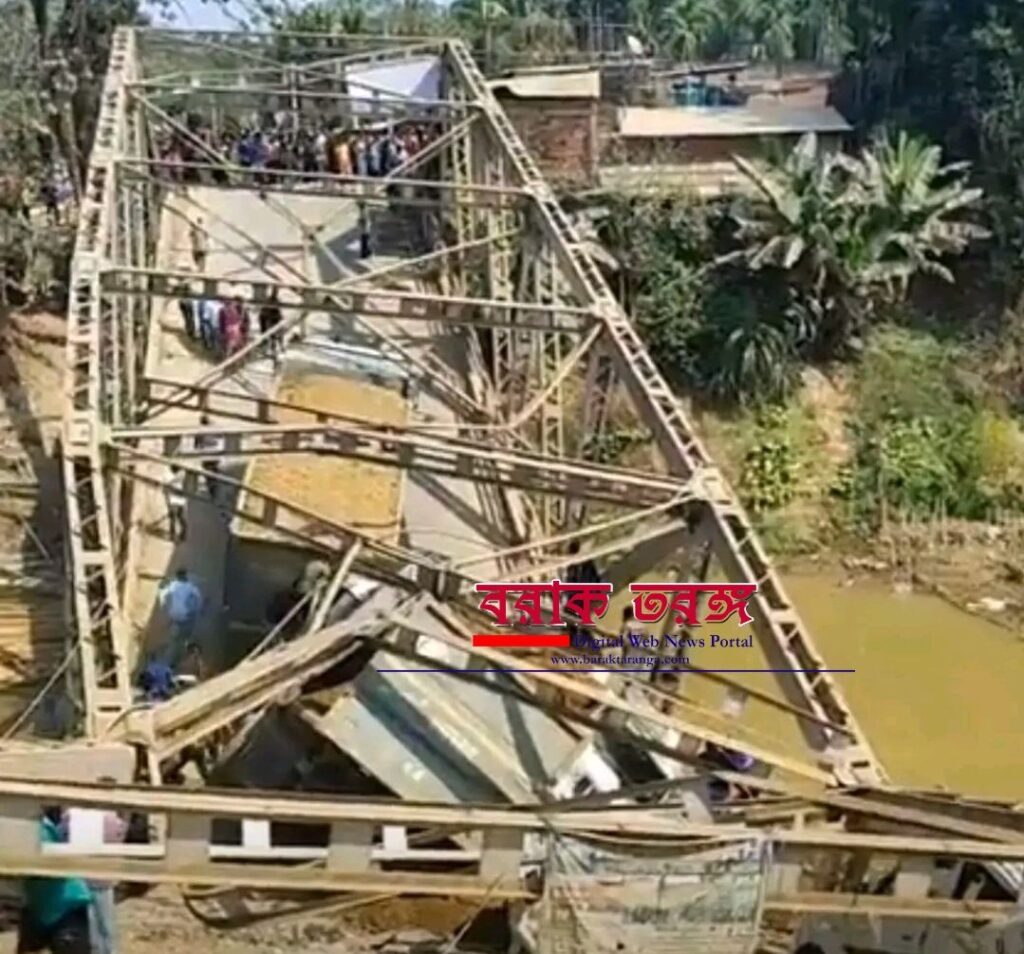 বরাক তরঙ্গ, ১১ ফেব্রুয়ারি : শ্রীভূমি জেলার আনিপুর এলাকায় সিংলা নদীর উপর বেইলি সেতুটি হঠাৎ ভেঙে পড়ে। জানা গেছে, বালু বোঝাই দুটি ডাম্পার সেতুর উপর দিয়ে পারাপারের সময় আচমকাই সেতুর মাঝের অংশ ধসে যায়। ঘটনাটি বুধবার দুপুর দিকে ঘটেছে।