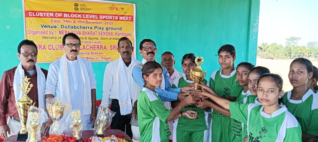 বরাক তরঙ্গ, ১৫ ডিসেম্বর : ভারত সরকারের যুব ও ক্রীড়া মন্ত্রণালয়ের অধীনে শ্রীভূমির মেরা যুবা ভারত কেন্দ্রের উদ্যোগে এবং সিংলাছড়ার ইন্দ্র ক্লাবের ব্যবস্থাপনায় ১৪ ও ১৫ ডিসেম্বর দুদিন ব্যাপী ক্লাস্টার ভিত্তিক ক্রীড়া প্রতিযোগিতা দুল্লভছড়া খেলার মাঠে অনুষ্ঠিত হয়েছে। প্রতিযোগিতার মধ্যে ছিল অ্যাথলেটিক্স, ভলিবল, ফুটবল এবং কাবাডি। ভলিবলে বিদ্যানগর স্পোর্টস অ্যাসোসিয়েশন ২৫-২০, ২৫-২২ এবং ২৫-১৮ পয়েন্টে জয়লাভ করে। পাশাপাশি, ফুটবলে মাগুরছড়া ট্রাইবাল ক্লাব ২-০ গোলে বর্মনবস্তি জনপ্রিয় ক্লাবকে হারিয়ে চ্যাম্পিয়ন হয়েছে। মেয়েদের কাবাডিতে মহিলা মজলিস ২৪-২০ পয়েন্টের ব্যবধানে সব্যসাচী ক্লাবকে হারিয়ে চ্যাম্পিয়ন হয়।