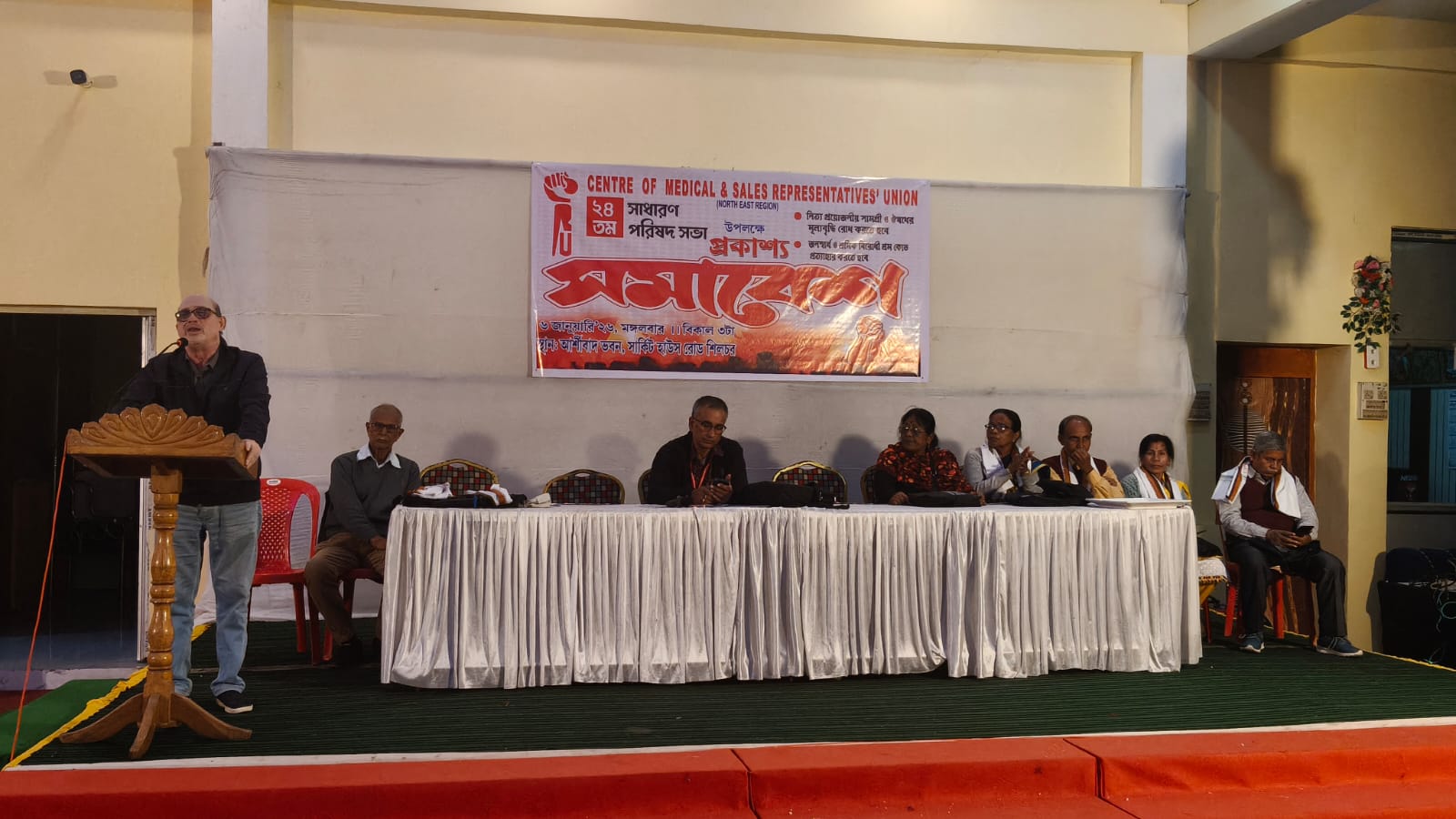 বরাক তরঙ্গ, ৬ জানুয়ারি : সেন্টার অব মেডিক্যাল অ্যান্ড সেলস রিপ্রেজেন্টেটিভস ইউনিয়ন (সিএমএসআরইউ, উত্তর-পূর্বাঞ্চল)-এর ২৪তম সাধারণ পরিষদ সভার অংশ হিসেবে মঙ্গলবার এক বিবাহ ভবনে প্রকাশ্য সমাবেশ অনুষ্ঠিত হয়। শ্রমিক নেতা, স্থানীয় নাগরিক ও যুবকরা ব্যাপক সংখ্যায় অংশ নেন। সমাবেশে জনস্বার্থবিরোধী শ্রম কোড প্রত্যাহার এবং নিত্যপ্রয়োজনীয় সামগ্রী ও ওষুধের মূল্যবৃদ্ধি রোধের দাবি জোরালোভাবে তোলা হয়। সংগঠনের নেতৃত্বে কাছাড় জেলাসহ উত্তর-পূর্বাঞ্চলে চলমান সংগ্রামকে আরও তীব্র করার সিদ্ধান্ত ঘোষণা করা হয়।