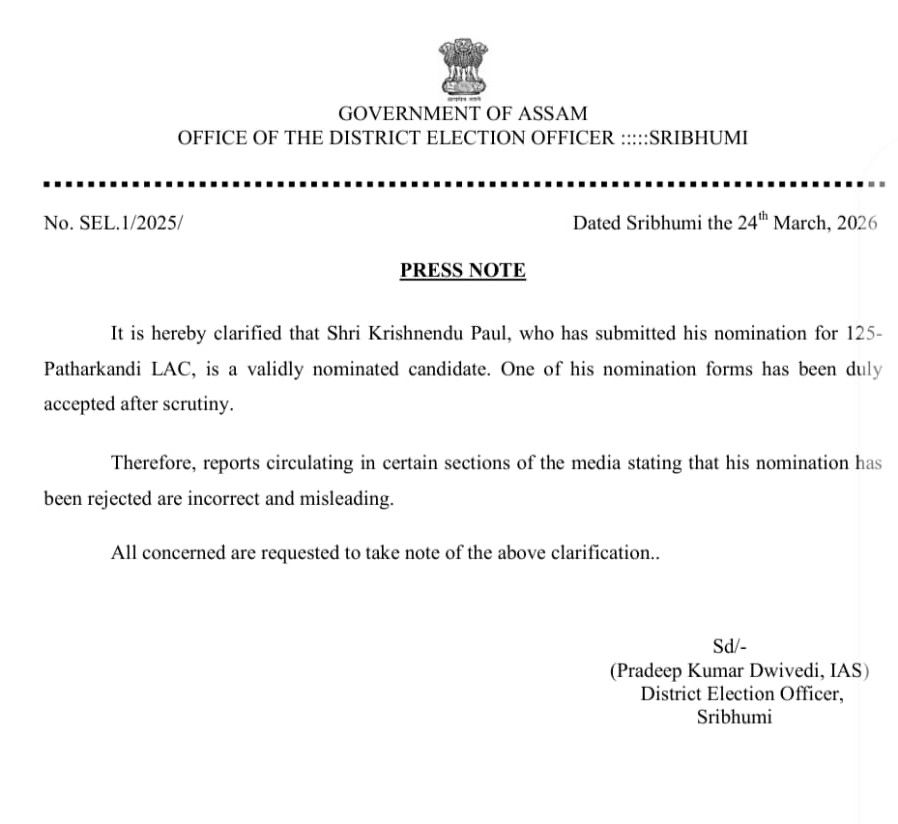 বরাক তরঙ্গ, ২৪ মার্চ : ১২৫ নম্বর পাথারকান্দি বিধানসভা কেন্দ্রে মনোনয়ন বিতর্কের জট অবশেষে কাটল। শ্রীভূমি জেলা প্রশাসনের তরফে স্পষ্ট জানিয়ে দেওয়া হয় কৃষ্ণেন্দু পাল একজন বৈধভাবে মনোনীত প্রার্থী এবং তাঁর মনোনয়নপত্র বাতিল হয়নি। পাথারকান্দি কেন্দ্রের কৃষ্ণেন্দু পালের মনোনয়ন বাতিল করা হয়েছে বলে সামাজিক মাধ্যমে ভাইরাল হয়ে পড়লে এই খবরকে “ভুল এবং বিভ্রান্তিকর” বলে উল্লেখ করে জেলা নির্বাচন আধিকারিক অফিস একটি আনুষ্ঠানিক প্রেস নোট জারি করে। প্রেস নোটে জানানো হয়েছে, পালের জমা দেওয়া মনোনয়নপত্রগুলির মধ্যে অন্তত একটি নির্ধারিত প্রক্রিয়া অনুযায়ী যাচাই-বাছাইয়ের পর গৃহীত হয়েছে। ফলে তিনি নির্বাচনে অংশগ্রহণের জন্য সম্পূর্ণ বৈধ প্রার্থী। জেলা নির্বাচন আধিকারিক প্রদীপকুমার দ্বিবেদী স্বাক্ষরিত ওই বিজ্ঞপ্তিতে সকল সংশ্লিষ্ট ব্যক্তিকে সঠিক তথ্যের উপর নির্ভর করার আহ্বান জানানো হয়েছে।