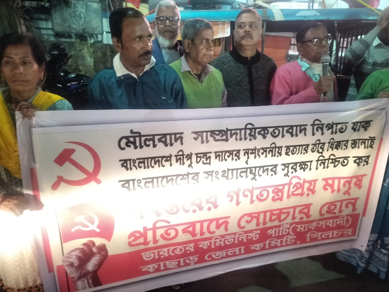 বরাক তরঙ্গ, ২৪ ডিসেম্বর : আজ সন্ধ্যায় সিপিআই (এম) এর প্রায় শতাধিক কর্মী মিছিল করে দেবদূত পয়েন্টে এসে পথসভা অনুষ্ঠিত করে। বাংলাদেশের বর্তমান পরিস্থিতিতে লাগাতার সংখ্যালঘু নির্যাতনের ঘটনা এবং সাম্প্রতিক দিপু দাস নামের দরিদ্র শ্রমিকের নৃশংস হত্যার বিরুদ্ধে এই মিছিল ও পথসভা। পথসভায় মূল বক্তা ছিলেন সিপিআই (এম) এর রাজ্য সম্পাদক ও কেন্দ্রীয় কমিটির সদস্য সুপ্রকাশ তালুকদার। এছাড়া বিদ্যুৎ দেব এবং দুলাল মিত্র বক্তব্য রাখেন ।তাঁরা মৌলবাদের বিরুদ্ধে তীব্র ধিক্কার জানান।