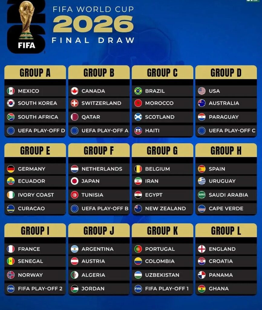 ৬ ডিসেম্বর : ১২টি গ্রুপ, ৪৮টি দল, তিন দেশে হবে খেলা- ফুটবল বিশ্বকাপকে এমনিতেই বলা হয় ‘গ্রেটেস্ট শো অন আর্থ’ – পৃথিবীর সেরা স্পোর্টস প্রতিযোগিতা যেন আরও বড় পরিসর করে নিলো, যেখানে ফিফার সদস্য তালিকার চার ভাগের এক ভাগ দলই এবারে প্রথম বিশ্বকাপ খেলবে।
