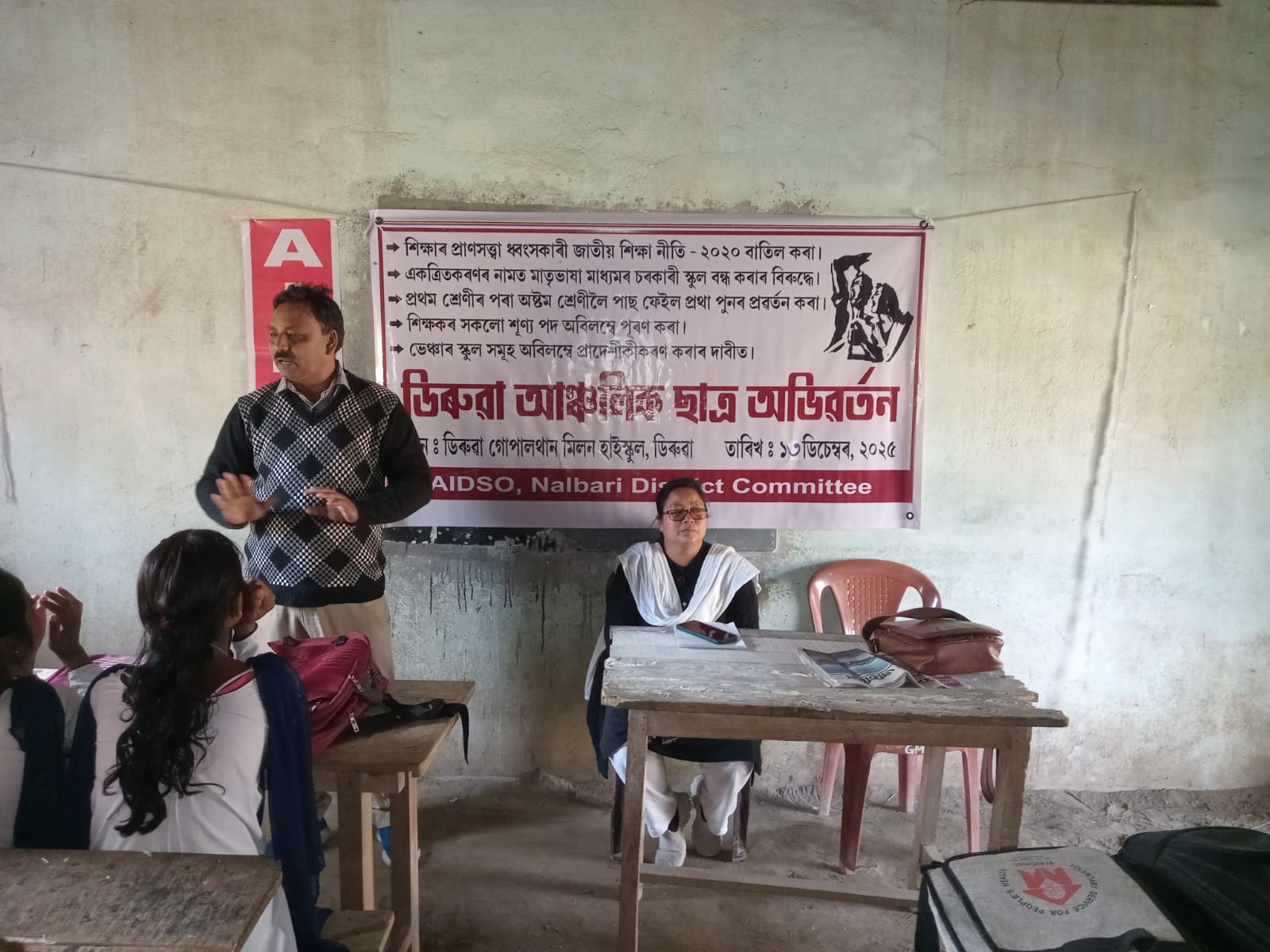 বরাক তরঙ্গ, ১৩ ডিসেম্বর : নলবাড়ির ডিরুবা অঞ্চলে এআইডিএসওʼর উদ্যোগে শিক্ষা ও জনবিরোধী জাতীয় শিক্ষা নীতি, ২০২০ বাতিল করা, সরকারি স্কুলের শূন্য পদে শিক্ষক নিয়োগ, অষ্টম শ্রেণি পর্যন্ত পুনরায় পাস ফেল প্রথা চালু করা, একত্রীকরণের নামে সরকারি শিক্ষা প্রতিষ্ঠান বন্ধ না করা, ভেঞ্চার স্কুল অভিলম্বে গ্রান্ট করা ইত্যাদি দাবিতে শিক্ষা অভিবর্তন অনুষ্ঠিত হয়। নলবাড়ি জেলা কমিটির অন্যতম সদস্য মালতী বসুমাতারির সভাপতিত্বে অনুষ্ঠিত অভিবর্তনে বক্তব্য রাখেন সংগঠনের রাজ্য কাউন্সিলের সভাপতি হিল্লোল ভট্টাচার্য।