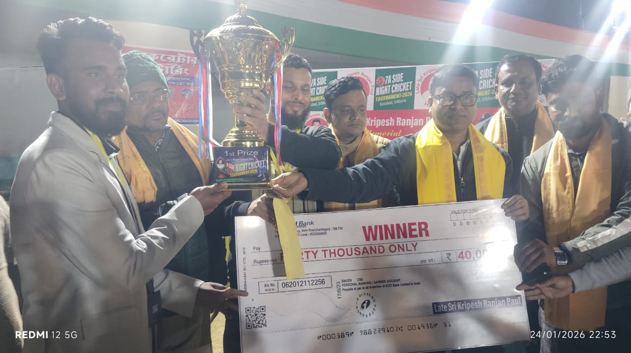 বরাক তরঙ্গ, ২৫ জানুয়ারি : ক্রীড়া ও উৎসবমুখর পরিবেশে কানিশাইলে সফলভাবে সমাপ্ত হল মন্ত্রী কৃষ্ণেন্দু পালের বাবার নামাঙ্কাতি প্রয়াত কৃপেশ রঞ্জন পাল স্মৃতি সেভেন-এ সাইড নাইট ক্রিকেট টুর্নামেন্ট। শনিবার গভীর রাতে অনুষ্ঠিত টুর্নামেন্টের ফাইনাল ম্যাচে দুর্দান্ত পারফরম্যান্স উপহার দিয়ে বদরপুর চমৎকার ক্লাব ৪ উইকেটের ব্যবধানে কানিশাইল খান ব্রাদার্স সেভেন স্টারকে পরাজিত করে চ্যাম্পিয়ন হওয়ার গৌরব অর্জন করে। এই জয়ের মাধ্যমে বদরপুর চমৎকার ক্লাব এ টুর্নামেন্টে দ্বিতীয়বারের মতো শিরোপা নিজেদের দখলে নিল। কানিশাইল লাইফ লাইন হাসপাতাল সংলগ্ন মাঠে রাত ১০টায় শুরু হওয়া ফাইনাল ম্যাচটি ঘিরে এলাকার ক্রীড়াপ্রেমী দর্শকদের মধ্যে ছিল ব্যাপক উৎসাহ-উদ্দীপনা। মাঠের চারপাশে উপচে পড়া ভিড়, করতালি আর উল্লাসে পুরো এলাকা যেন এক উৎসবের রূপ নেয়।