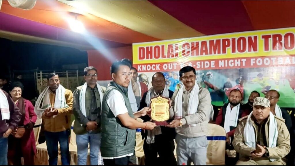 বরাক তরঙ্গ, ৪ ডিসেম্বর : ধলাই চ্যাম্পিয়ন ট্রফি ২০২৫ নকআউট সিক্স-এ সাইড নাইট ফুটবল টুর্নামেন্টে খেতাব অর্জন করল ভাগাবাজারের মরিয়ম মোবাইল স্টোর এফসি। প্রথমবারের মতো ধলাইর মাঠে ফ্লাডলাইটে অনুষ্ঠিত টানটান উত্তেজনাপূর্ণ মেগা ফাইনালে বিপক্ষ বাবলু লস্করের স্পন্সরশিপে ডিমা ডাউলিং এফসি ধলাইকে ২-০ গোলের ব্যবধানে পরাস্ত করে চ্যাম্পিয়ন শিরোপা অর্জন করে ভাগাবাজারের দলটি।