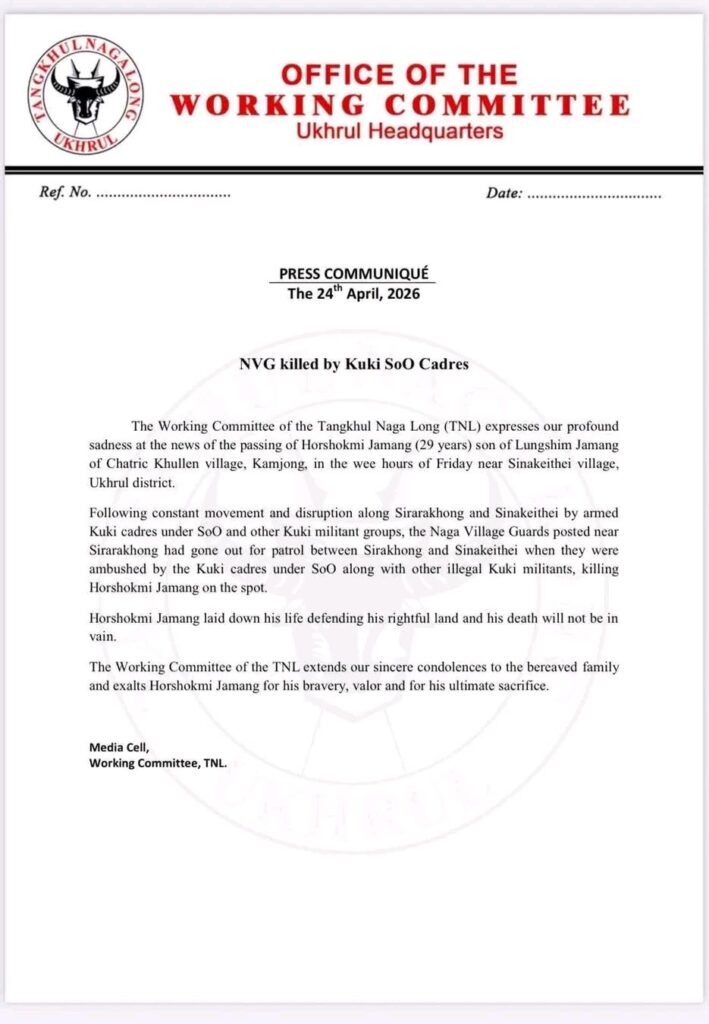 সিরারাখং ও সিনাকেইথেই এলাকার আশপাশে SoO-র আওতাধীন সশস্ত্র কুকি ক্যাডার এবং অন্যান্য কুকি জঙ্গি গোষ্ঠীর ক্রমাগত চলাচল ও অস্থিরতার প্রেক্ষিতে, সিরারাখংয়ের নিকটে মোতায়েন নাগা ভিলেজ গার্ডরা সিরারাখং ও সিনাকেইথেইর মাঝামাঝি এলাকায় টহলে বেরিয়েছিলেন। সেই সময় SoO-র অধীন কুকি ক্যাডার এবং অন্যান্য অবৈধ কুকি জঙ্গিরা অতর্কিত হামলা চালায়, এতে ঘটনাস্থলেই হোরশোকমি জামাং নিহত হন। নিজের ন্যায্য ভূমি রক্ষার জন্য হোরশোকমি জামাং জীবন উৎসর্গ করেছেন, তার এই মৃত্যু বৃথা যাবে না। টিএনএল-এর ওয়ার্কিং কমিটি শোকসন্তপ্ত পরিবারের প্রতি আন্তরিক সমবেদনা জানাচ্ছে এবং হোরশোকমি জামাং-এর সাহস, বীরত্ব ও সর্বোচ্চ আত্মত্যাগকে শ্রদ্ধার সঙ্গে স্মরণ করছে বলে জানানো হয়।