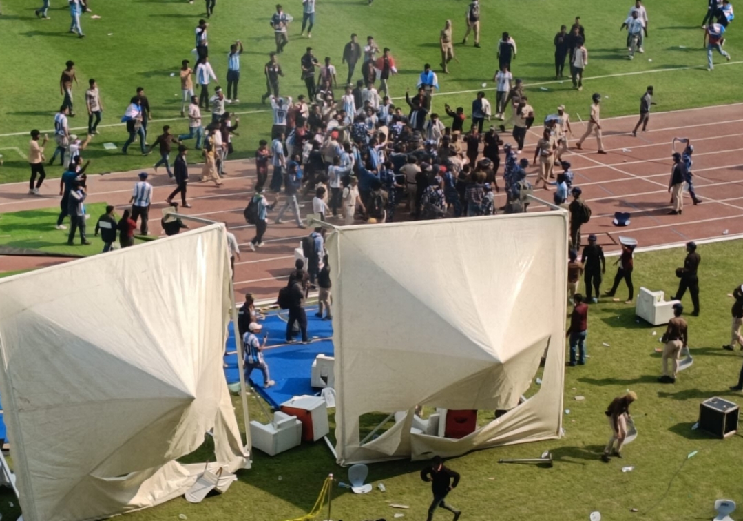 শনিবার মেসির অনুষ্ঠান ঘিরে রণক্ষেত্রে পরিণত হয় যুবভারতী ক্রীড়াঙ্গন। পুলিশ-জনতা খণ্ডযুদ্ধ বাধে। ক্ষুব্ধ জনতা দখল নিয়ে নেয় যুবভারতীর। তাঁদের অভিযোগ ছিল, মেসিকে ঘিরে ছিলেন নেতা-মন্ত্রীরাও। আরও অভিযোগ, মেসি যুবভারতীতে পৌঁছোতেই অন্তত ৭০-৮০ জন মানুষের ভিড় ঘিরে ধরে তাঁকে। গ্যালারি থেকে তাঁকে দেখাই যায়নি। চড়া দামে টিকিট কেটেও মেসিকে দেখতে না পাওযায় ক্ষুব্ধ হয়ে ওঠে জনতা। পরিস্থিতি সামাল দিতে নামানো হয় ব়্যাফ। ছেঁড়া হয় মেসির পোস্টারও।