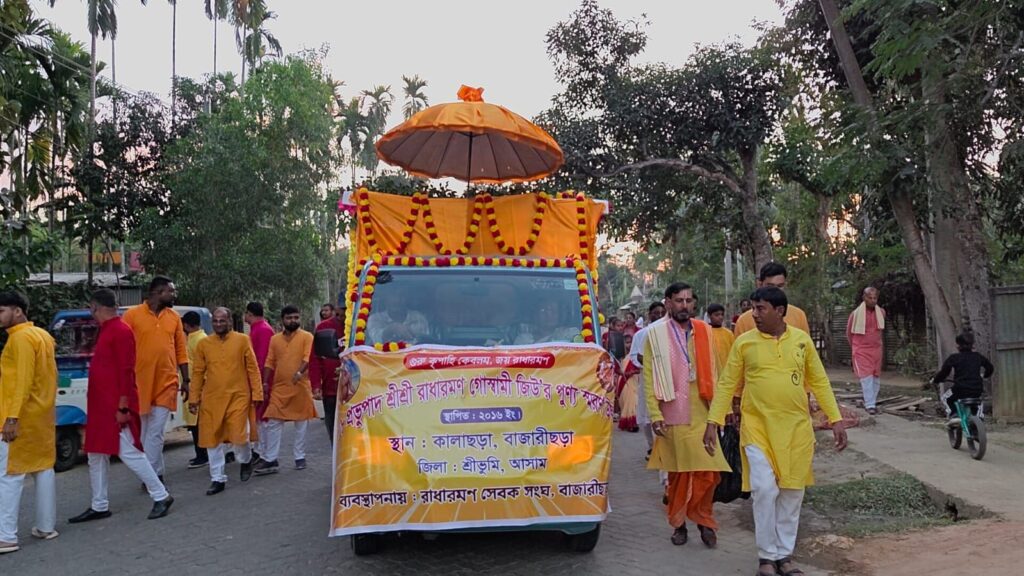 সংবর্ধনা পর্ব শেষে মহিলাদের উলুধ্বনি ও মৃদঙ্গ পূজনের মাধ্যমে অনুষ্ঠানের প্রারম্ভিক পর্ব সম্পন্ন হয়। এরপর শঙ্খধ্বনির মধ্য দিয়ে আশ্রম প্রাঙ্গণ থেকে শুভাযাত্রার সূচনা হয়। প্রভুপাদ শ্রীশ্রী রাধারমণ গোস্বামী জিউরের শ্রীবিগ্রহ সুসজ্জিত রথে স্থাপন করে কালাছড়া ও বাজারিছড়া পরিক্রমা করা হয়। এই শোভাযাত্রায় গুরুভ্রাতা ও ভগিনীরা ধুতি-পাঞ্জাবি ও হলুদ শাড়ি পরিধান করে কীর্তনের মাধ্যমে সমগ্র রাজপথ পরিক্রমা করেন।