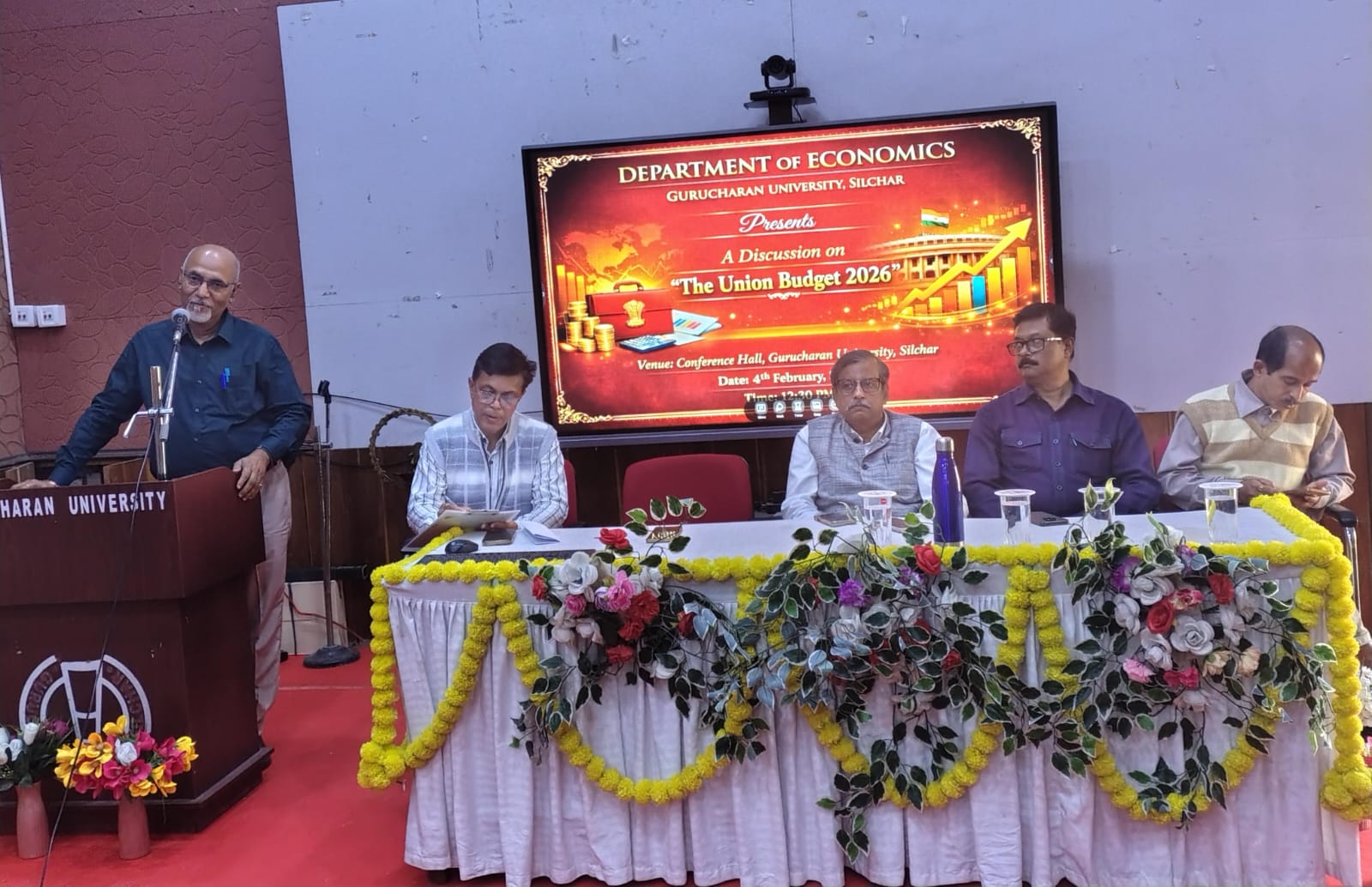 বরাক তরঙ্গ, ৪ ফেব্রুয়ারি : গুরুচরণ বিশ্ববিদ্যালয়ের অর্থনীতি বিভাগের উদ্যোগে বুধবার বিশ্ববিদ্যালয়ের সভাকক্ষে “কেন্দ্রীয় বাজেট ২০২৬–২৭” শীর্ষক এক আলোচনা সভার আয়োজন করা হয়। সভায় উপস্থিত ছিলেন বিশ্ববিদ্যালয়ের উপাচার্য অধ্যাপক নিরঞ্জন রায়, নিবন্ধক ড. অভিজিৎ নাথ, শৈক্ষিক নিবন্ধক ড. অভিজিৎ নাথ এবং অর্থনীতি বিভাগের বিভাগীয় প্রধান ড. রনবিজয় দাস।