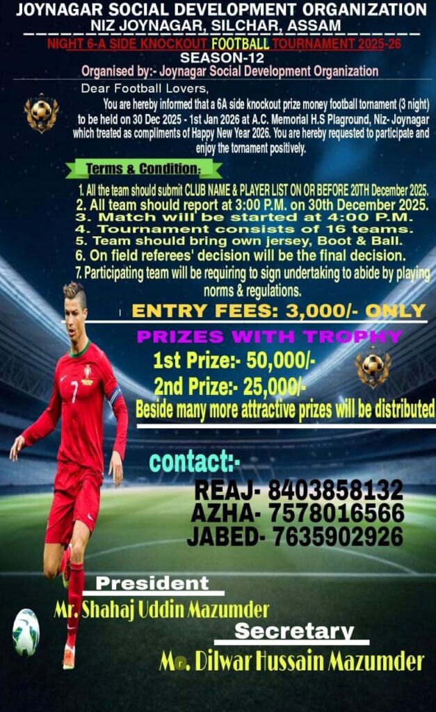 বরাক তরঙ্গ, ২৭ ডিসেম্বর : ইংরেজি নববর্ষ উপলক্ষে আগামী ৩০ ডিসেম্বর থেকে ১ জানুয়ারি পর্যন্ত  তিনরাতব্যাপী ৬-এ সাইড নকআউট প্রাইজমানি ফুটবল টুর্নামেন্টের আয়োজন করছে জয়নগর সোশ্যাল ডেভেলপমেন্ট অর্গানাইজেশন।  নিজ-জয়নগরের এসি মেমোরিয়াল উচ্চবিদ্যালয় খেলার মাঠে ৩০ ডিসেম্বর বিকেল চারটায় শুরু হবে টুর্নামেন্ট।