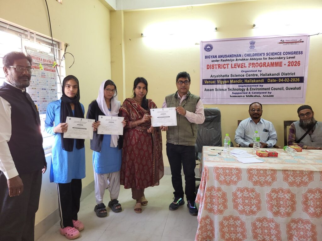 বরাক তরঙ্গ, ৪ ফেব্রুয়ারি : শিশু বিজ্ঞান সমারোহের হাইলাকান্দি জেলা ভিত্তিক অনুষ্ঠান বুধবার জেলার বিজ্ঞান মন্দিরে ব্যাপক উৎসাহ উদ্দীপনায় আয়োজিত হয়। আসাম বিজ্ঞান প্রযুক্তিবিদ্যা এবং পরিবেশ পরিষদের অধীনে থাকা আর্যভট্ট বিজ্ঞান কেন্দ্র হাইলাকান্দির ব্যবস্থাপনায় এই জেলা ভিত্তিক অনুষ্ঠানটি অনুষ্ঠিত হয়। জেলার তিনটি শিক্ষা ব্লক থেকে নির্বাচিত ছাত্রছাত্রীরা তাদের প্রকল্প নিয়ে অনুষ্ঠানে উপস্থিত হয়। উল্লেখ্য, ছাত্রছাত্রীরা বিজ্ঞান অনুসন্ধানের মূল বিষয় জলবায়ুর পরিবর্তনের উপর ভিত্তি করে তথ্য ভিত্তিক প্রকল্প উপস্থাপন করেন। হাইলাকান্দি জেলার বিভিন্ন সরকারি বিদ্যালয়ের শিক্ষার্থীরা অত্যন্ত প্রাঞ্জল ভাষায় নির্দিষ্ট বিষয়ের বিচারকদের সামনে প্রকল্প উপস্থাপন করেন।