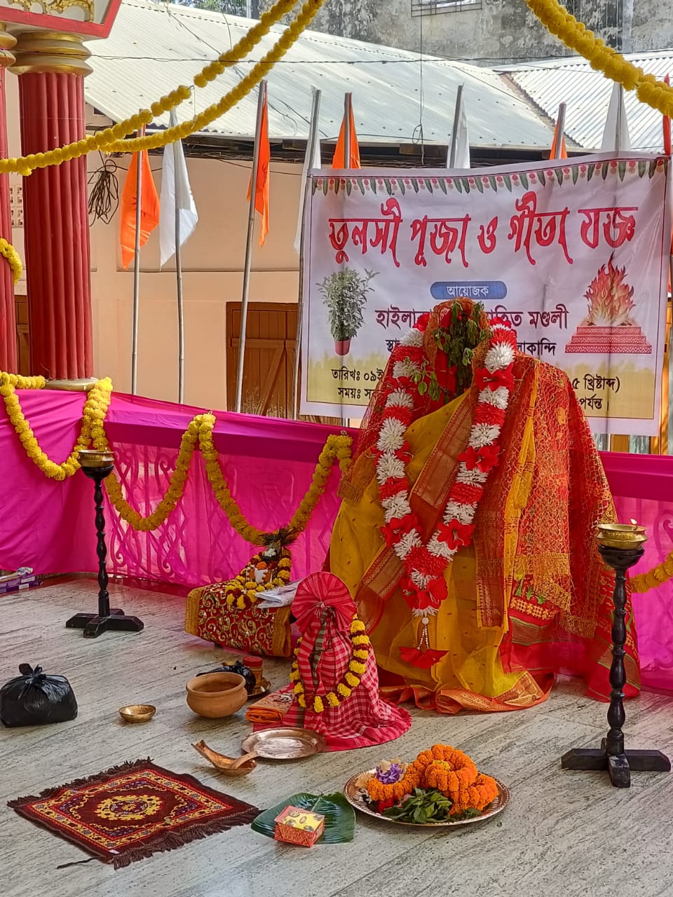 বরাক তরঙ্গ, ২৬ ডিসেম্বর : সারা দেশের সাথে সঙ্গতি রেখে হাইলাকান্দিতেও সম্পন্ন হলো তুলসী পূজা, গীতা যজ্ঞ, ভজন, কীর্তনের অনুষ্ঠান। হাইলাকান্দি পুরোহিত মণ্ডলী দ্বারা আয়োজিত এই অনুষ্ঠান বৃহস্পতিবার স্থানীয় আদি কালীবাড়িতে অনুষ্ঠিত হয়। সনাতন সংস্কৃতিকে নবপ্রজন্মের সঙ্গে পরিচয় করিয়ে দিতে এবং পাশ্চাত্য সংস্কৃতি থেকে দূরে সরিয়ে রাখতে তুলসী দেবী ও তুলসীগাছের মাহাত্ম্য তুলে ধরতে এদিন অনুষ্ঠানের শুভারম্ভ হয় ধ্বজারোহনের মাধ্যমে। সকাল দশটায় বৈদিক মন্ত্রোচ্চারণের মাধ্যমে ধ্বজ উত্তোলন করেন সংস্কৃত ভারতী হাইলাকান্দি জেলা সভাপতি তথা বিশিষ্ট সমাজকর্মী সুশান্ত মোহন চট্টোপাধ্যায়। এরপর প্রদীপ প্রজ্জ্বলন করেন সুশান্ত মোহন চট্টোপাধ্যায় ও বিশিষ্ট পুরোহিত শুভময় ভট্টাচার্য। একই সাথে সমবেত ও একক ভাবে তুলসী বন্দনা পরিবেশিত হয়।