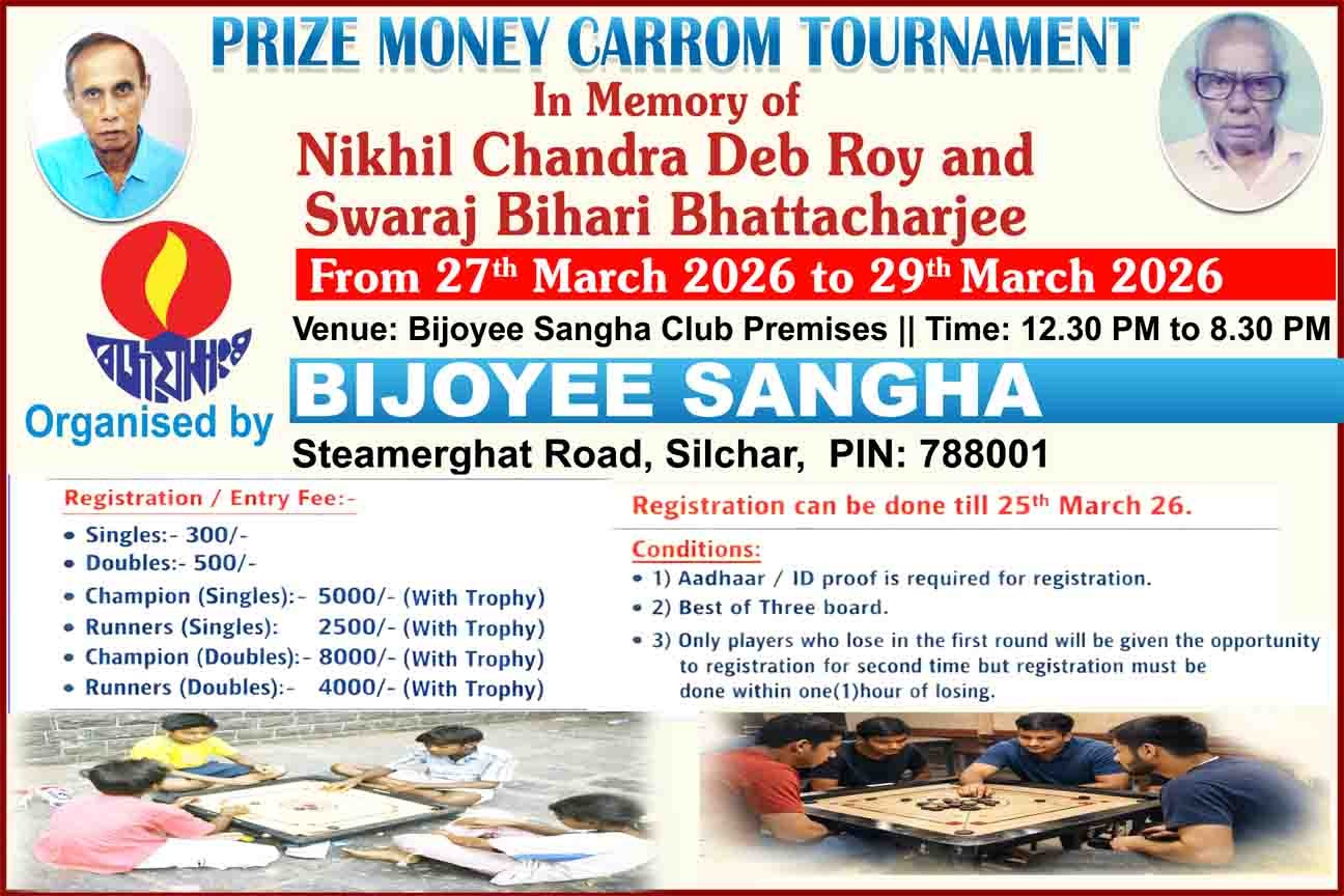 বরাক তরঙ্গ, ২২ মার্চ : নিখিলচন্দ্র দেবরায় ও স্বরাজ বিহারী ভট্টাচার্যের স্মৃতিতে আগামী ২৭ মার্চ থেকে ২৯ মার্চ শিলচর স্টিমারঘাট বিজয়ী সংঘ ক্লাবের ব্যবস্থাপনায় এক প্রাইজমানি ক্যারম প্রতিযোগিতার আয়োজন করা হয়েছে। সিঙ্গল চ্যাম্পিয়নকে প্রাইজমানি হিসাবে ৫০০০ টাকা নগদ সঙ্গে একটি ট্রফি দেওয়া হবে, ডবলে চ্যাম্পিয়ন হলে নগদ ৮০০০ হাজার টাকা তৎসঙ্গে একটা ট্রফি দেওয়া হবে। সিঙ্গুলে রানার্সকে ২৫০০ হাজার টাকা এবং একটি ট্রফি দেওয়া হবে, ডবল বিজয়ী রানার্সকে ৪০০০ হাজার টাকা নগদ সঙ্গে একটি ট্রফি দেওয়া হবে। প্রতিদিন খেলা শুরু হবে দুপুর ১২ টা ৩০ মিনিট থেকে রাত ৮টা ৩০ মিনিট পর্যন্ত। এই খেলায় অংশগ্রহণকারী ইচ্ছুক খেলোয়াড়রা আগামী ২৫ মার্চে ভেতর রেজিস্ট্রেশন করানোর আবাহন জানান বিজয়ী সংঘ ক্লাবের কর্মকর্তা দের পক্ষ থেকে।